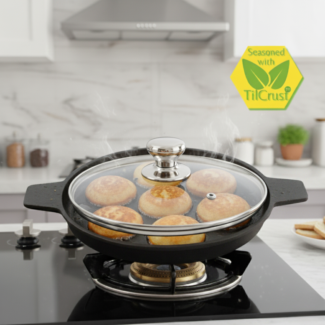 Trilonium Triple Seasoned Cast Iron 7 Pits Paniyaram Pan with Lid 16 cms