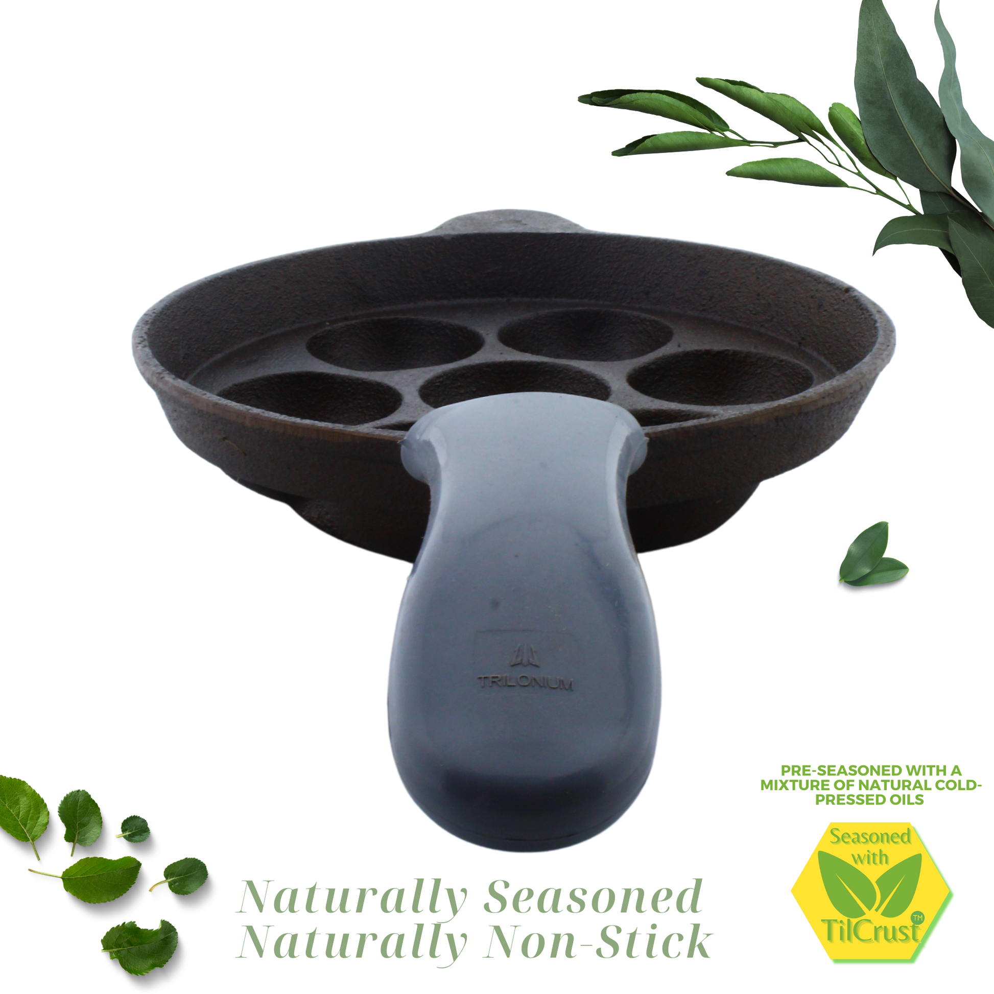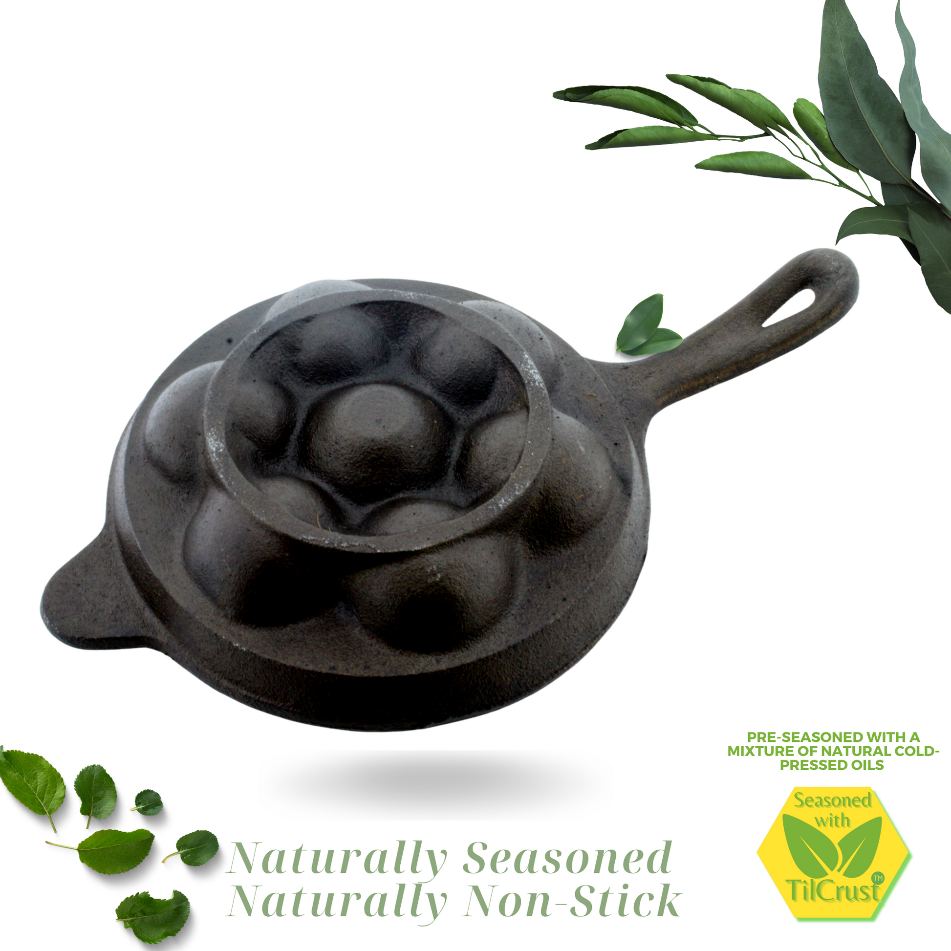 Cast Iron Paniyaram Pan 7 Pits | Pre-Seasoned | 7.6 Inches | 2 Kgs | Long Handle | with Silicone Sleeve | Induction Compatible