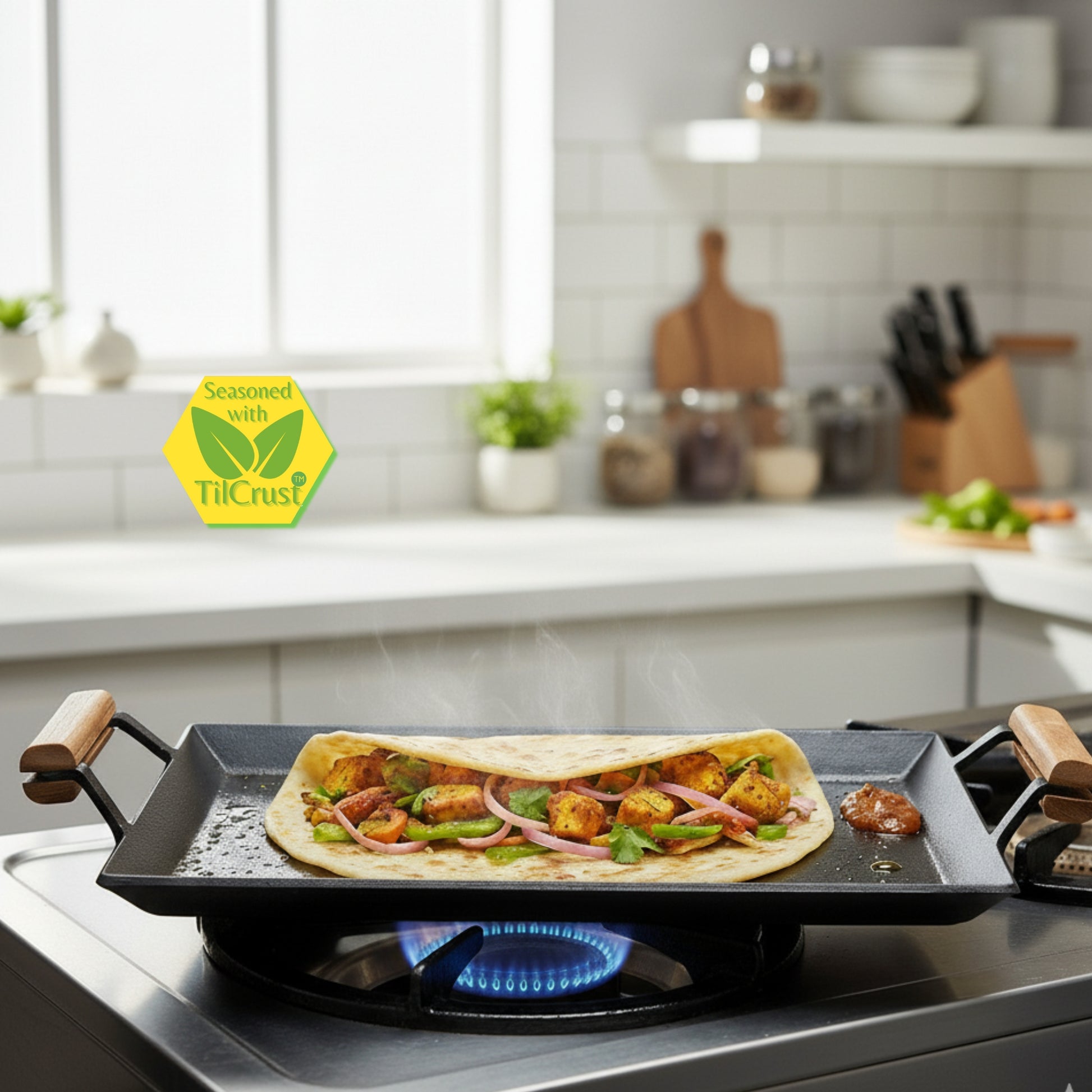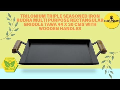 Trilonium Triple Seasoned Iron Rudra Multi Purpose Rectangular Griddle Tawa 44 x 30 cms with Wooden Handles